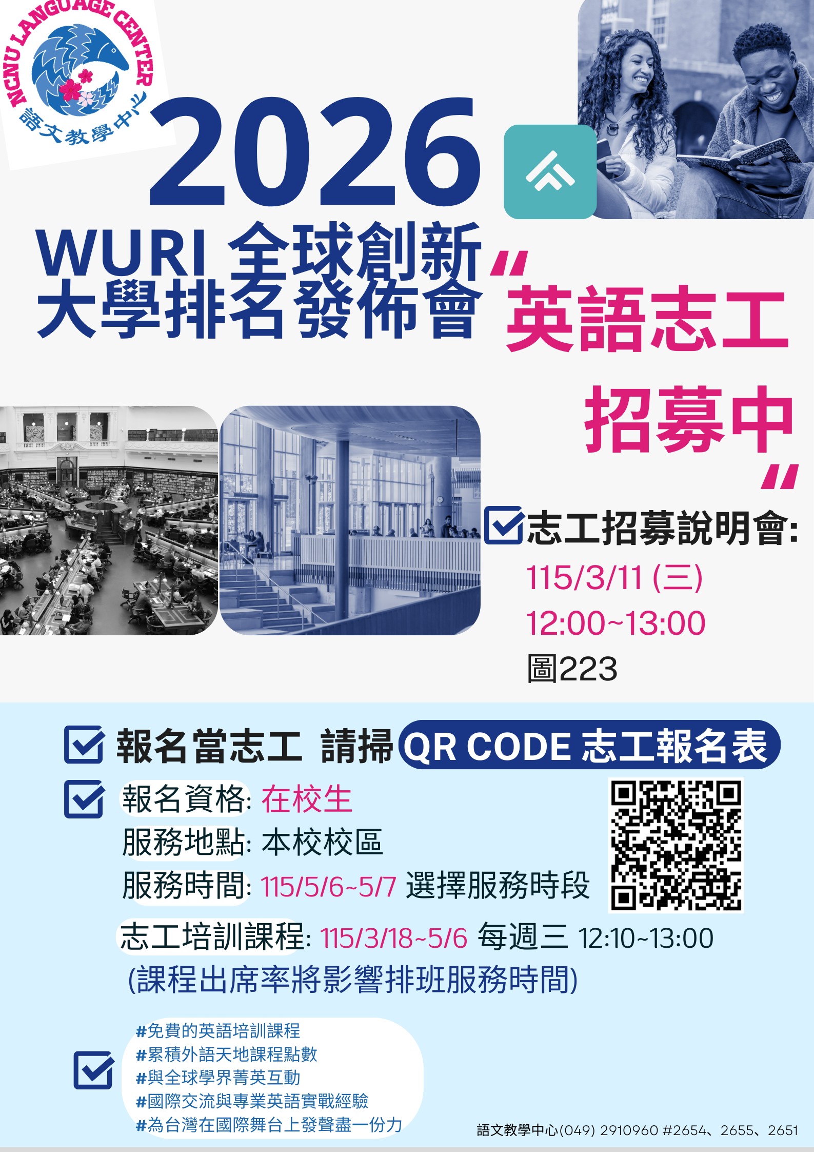【重要公告】2026 WURI全球創新大學排名發布會志工召集令