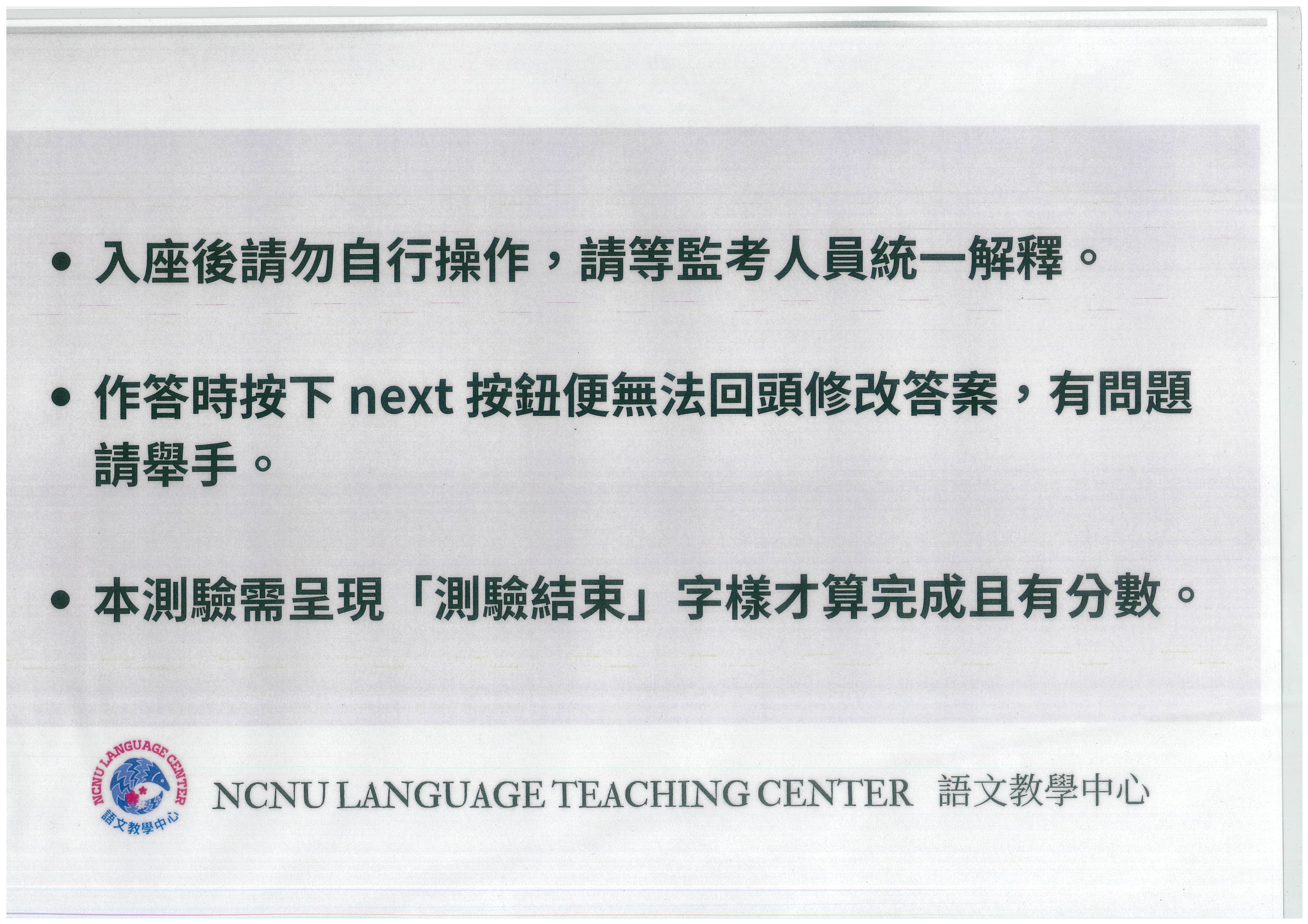 請攜帶有照片身分證件(身分證、健保卡、駕照、護照)及有線耳機應考。