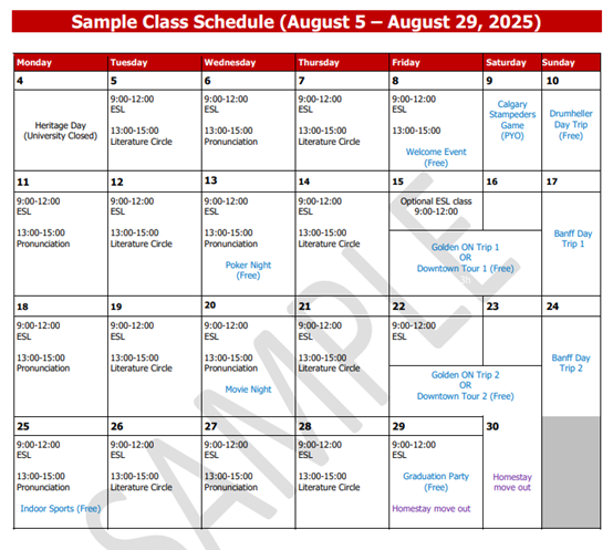 該費用包含了學費、結業證書、寄宿家庭、每日三餐、機場接送、使用洗衣設施、健康保險、校園設施使用及教科書、本地交通卡;不包含機票、本地交通卡以外的交通票費、ETA(加拿大電子旅行證)申請費、踏雪健行(自由行程)、諾基斯卡滑雪/滑雪板課(自由行程)、其他市外旅遊、個人往返地點的交通、個人衛生用品、清潔服務、自選活動費、課程開始前和結束後的延伸緊急醫療保險。