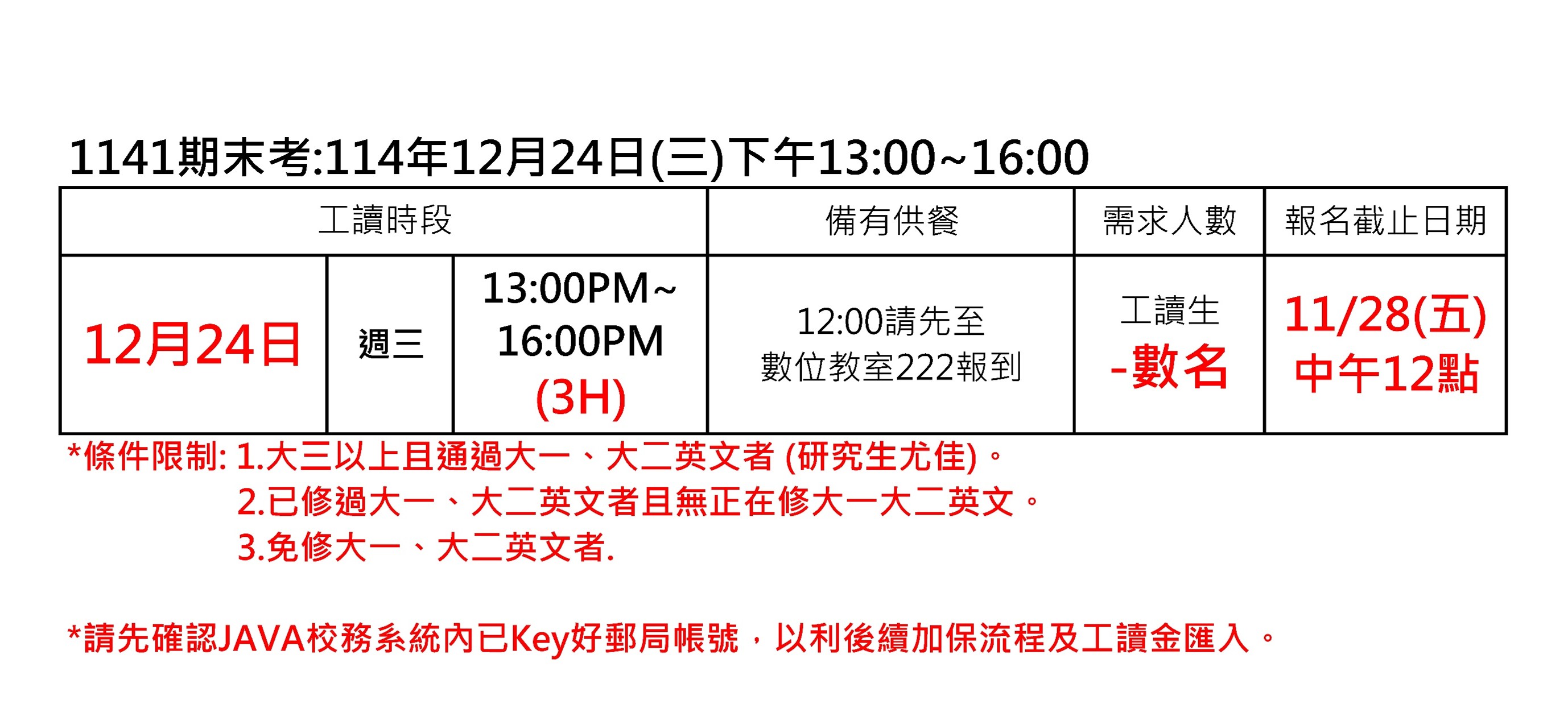 【人才招募】徵聘114年12月24日(三)大一、大二英文期末考工讀生數名