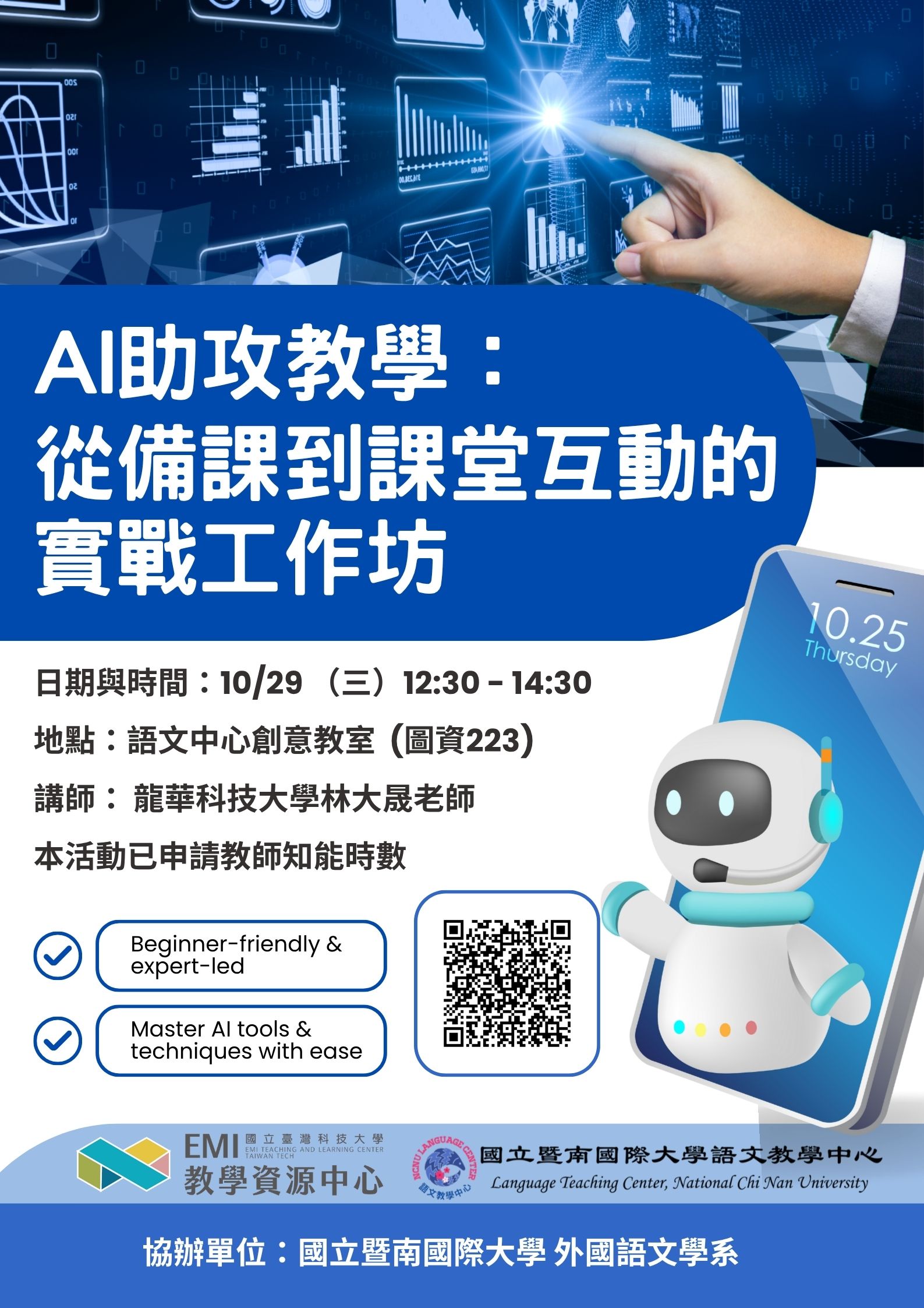 活動內容:本次工作坊旨在協助教師掌握 AI 工具,將其應用於日常教學,提升教學效率與課堂互動品質。無論您是 AI 工具的初學者或已有基礎,都能從中獲益。