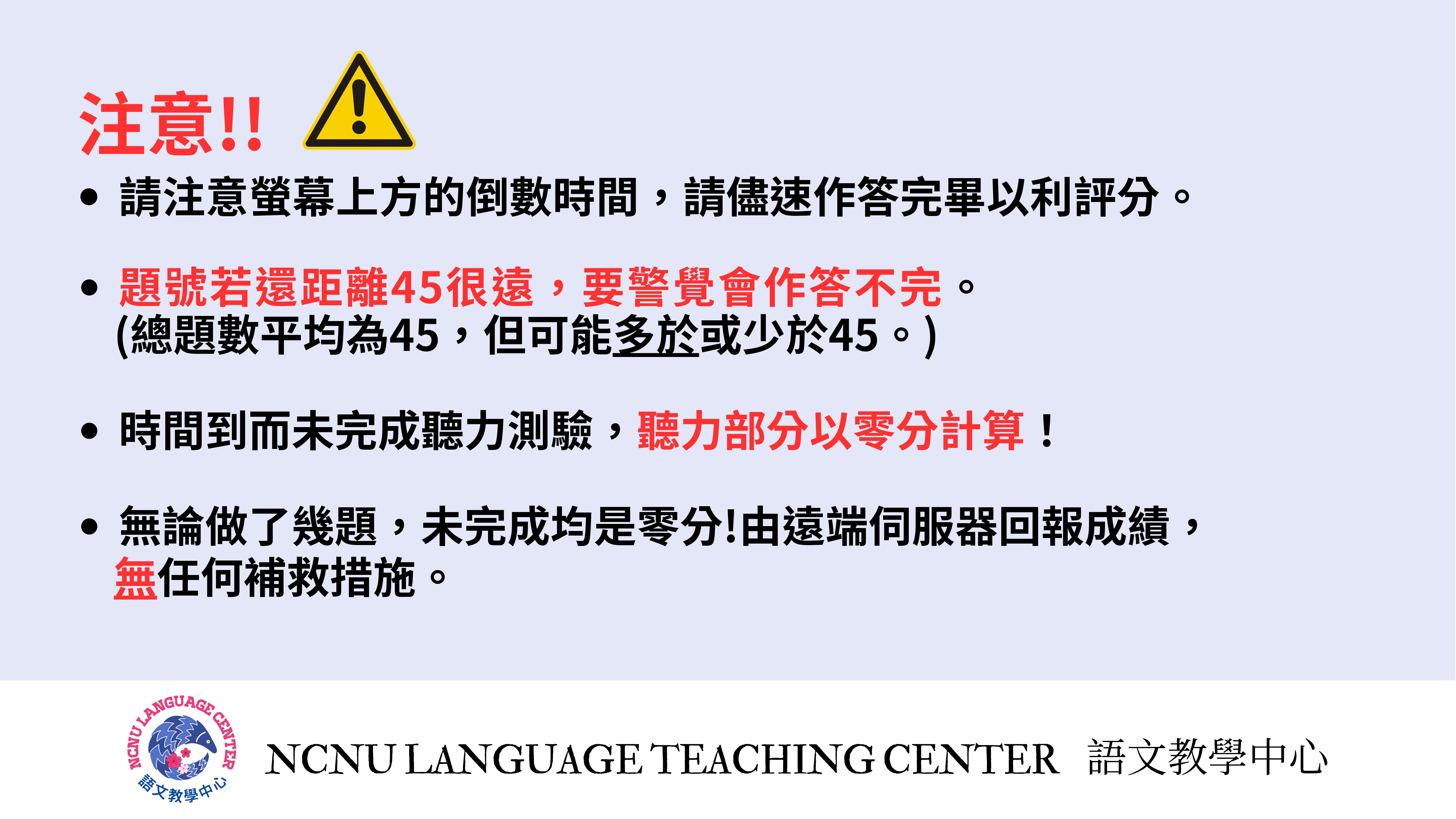 請攜帶有照片身分證件(身分證、健保卡、駕照、護照)及有線耳機應考。