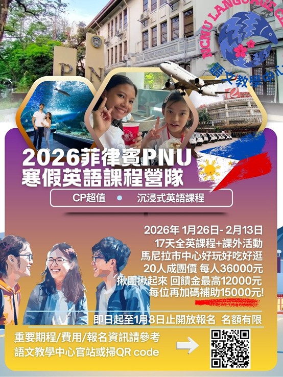想在寒假用最有效率的方式提升英語實力,同時親身體驗東南亞首都的文化魅力嗎?本營隊攜手菲律賓頂尖師資培育重鎮Philippine Normal University(PNU),打造結合密集英語課程、校園生活體驗與城市文化導覽的超值海外學習行程。20人成行,限額30名。